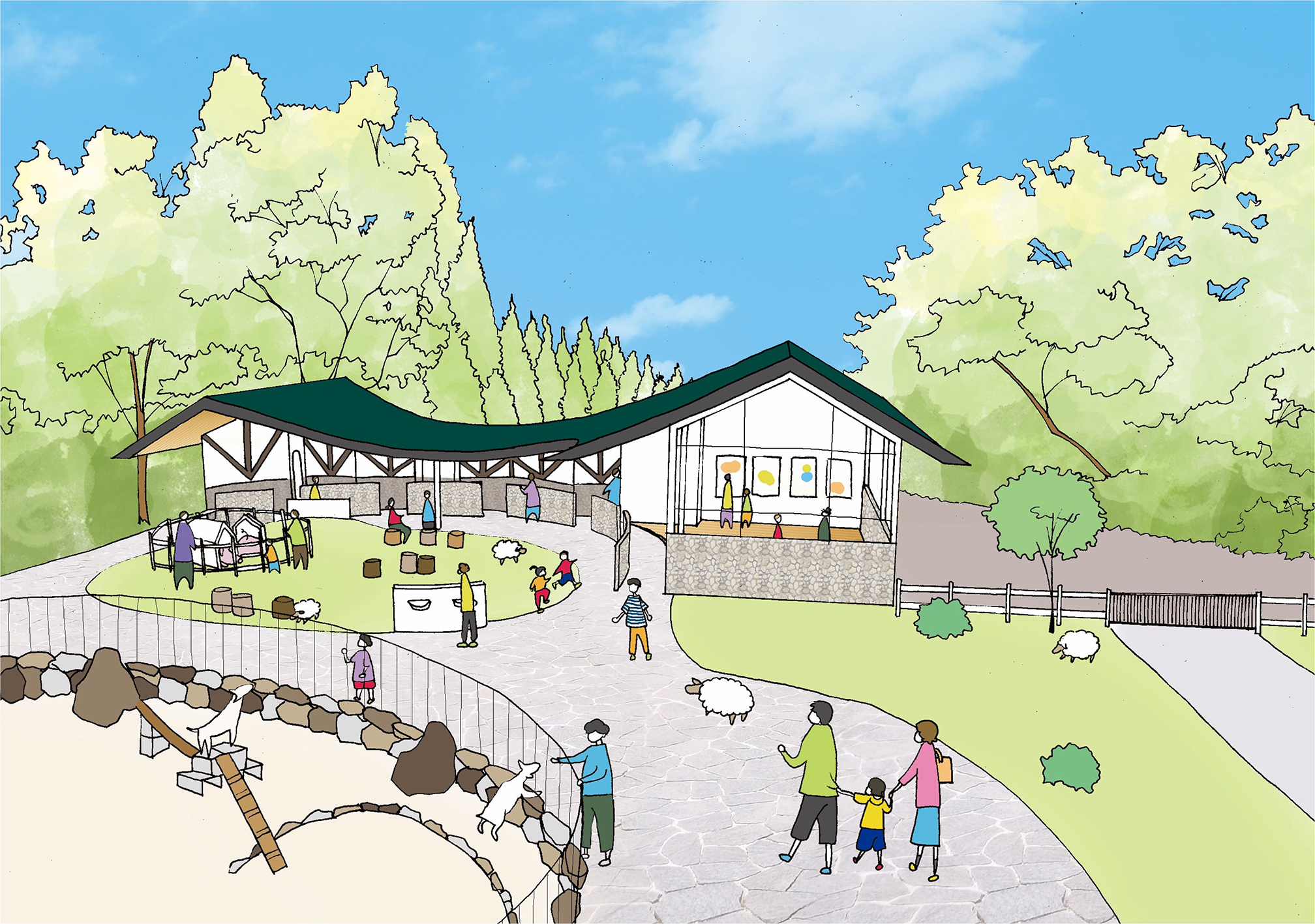 動線計画として、「いやしの輪」をつくることで、来場者の主な動線となる北イベント広場側からの人の流れをデザイン。 アルプス山脈を思わせる形状の大屋根、御影の丸石の腰壁、動物と触れ合えるいやしの丘など、六甲山牧場ののどかな環境に相応しい外観とします。